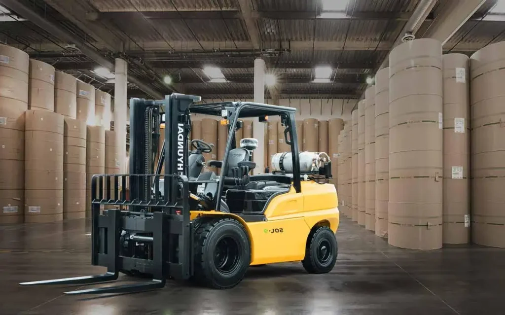 Forklift dengan kapasitas 5 ton dengan mast forklift standard yang dapat mencapai ketinggian hingga 3 meter.